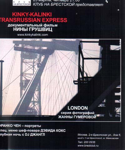 «Кинки-Калинки» Трансрусский Экспресс»» - это документальный фильм о «броуновском движении» внутри искусства, музыки, клубной жизни, сцены, лондонского Сити, об их единстве и противоречиях, столкновении и взаимопроникновении.